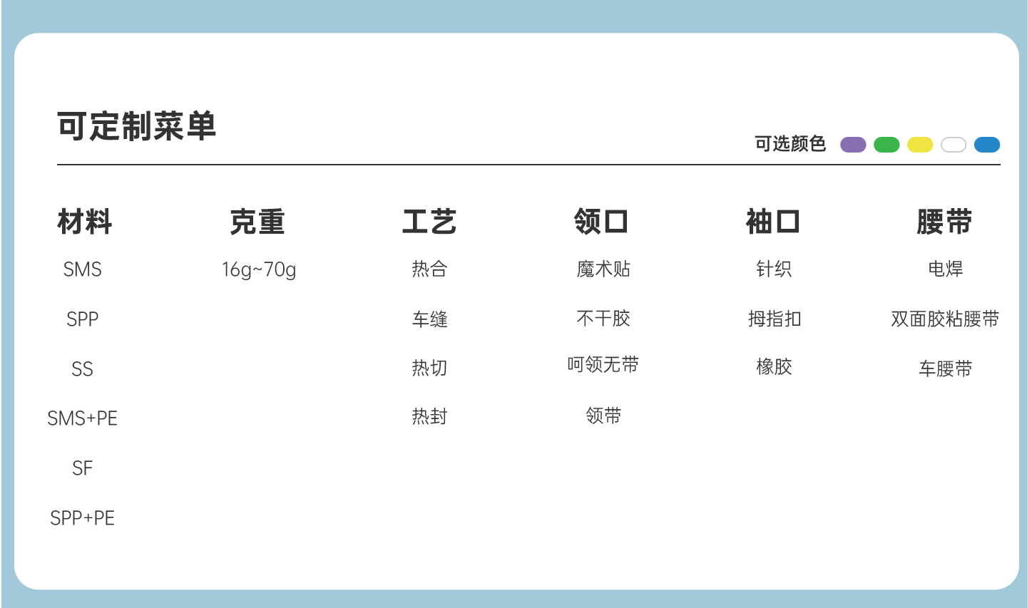 顏色:白色、黃色、藍(lán)色