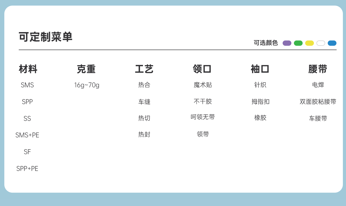 工藝:熱合、橡筋袖口領(lǐng)口領(lǐng)帶、點焊腰帶